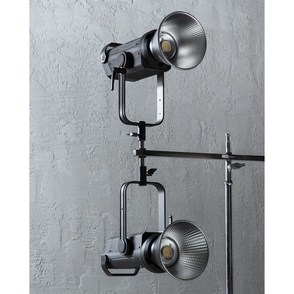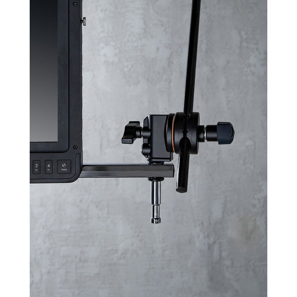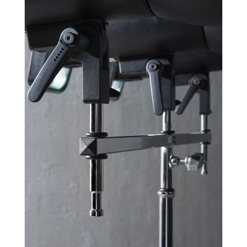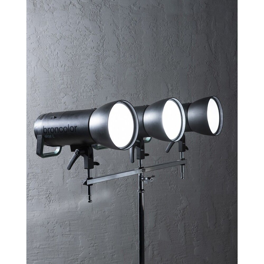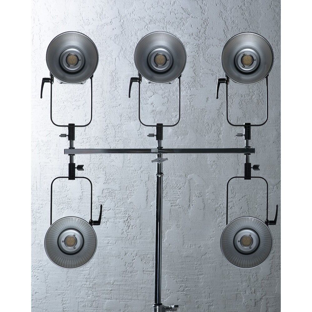 This triple header allows to mount up to 5 five light heads on one heavy duty light stand. The header is long 65cm and has five 16mm pins and one 16mm receiver.
