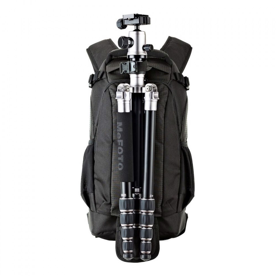 - Hideaway Tripod Mount secures a compact tripod to the pack