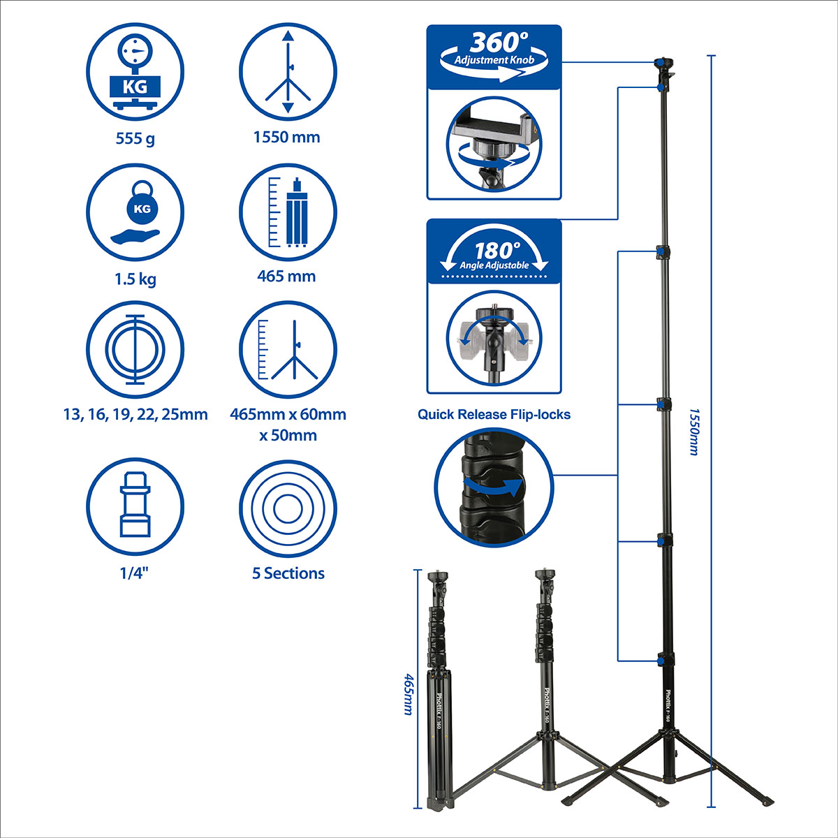 The Phottix F160 Light Stand, Black - 160cm is the ideal solution for users seeking a lightweight, compact and quick to set up stand. With an extendable height ranging from a minimum of 46.5cm to a maximum of 160cm and a collapsed length of just 46.5cm, this stand is highly portable and easy to store. Weighing only 555g, its four section column design and quick-release flip locks allow for fast setup in seconds, making it a convenient choice for on-the-go creators.