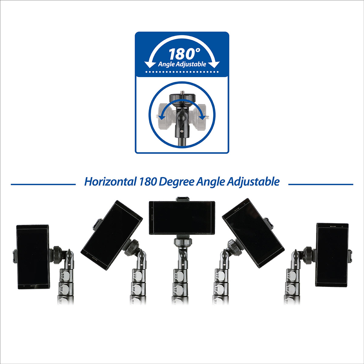 The flexible head features a 1/4" screw adapter, offering 360° vertical rotation via an adjustment knob and 180° horizontal rotation. This allows smartphones or other devices to achieve optimal shooting angles. The stand includes a universal phone clamp with a cold shoe mount and a carry bag for added convenience.