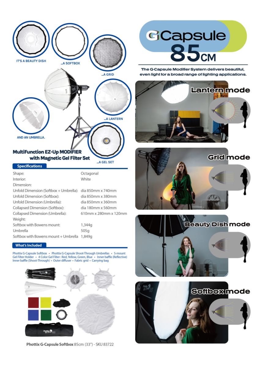 The G-Capsule series is the world’s first all-in-one panoramic light softbox with patented features, offering four versatile modes: Softbox, Grid, Beauty Dish, and Lantern.