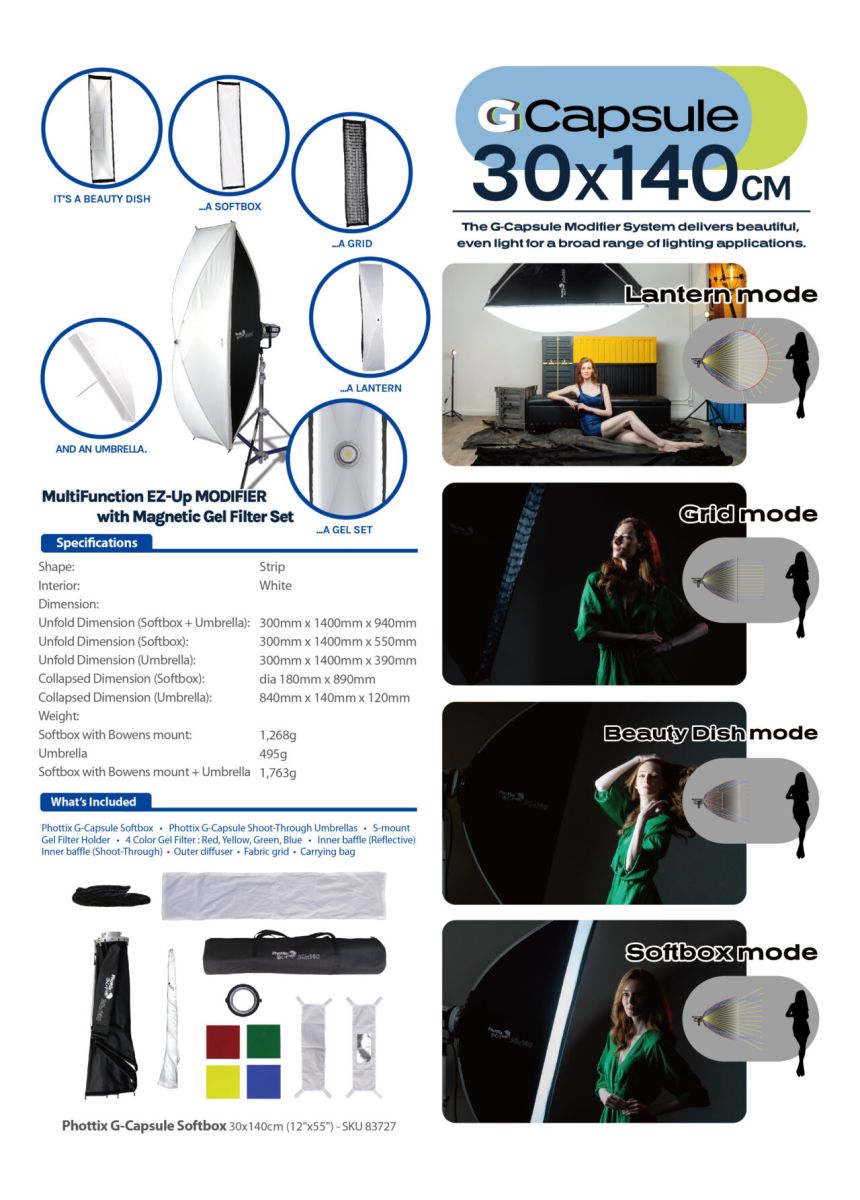 The G-Capsule series is the world’s first all-in-one panoramic light softbox with patented features, offering four versatile modes: Softbox, Grid, Beauty Dish, and Lantern.