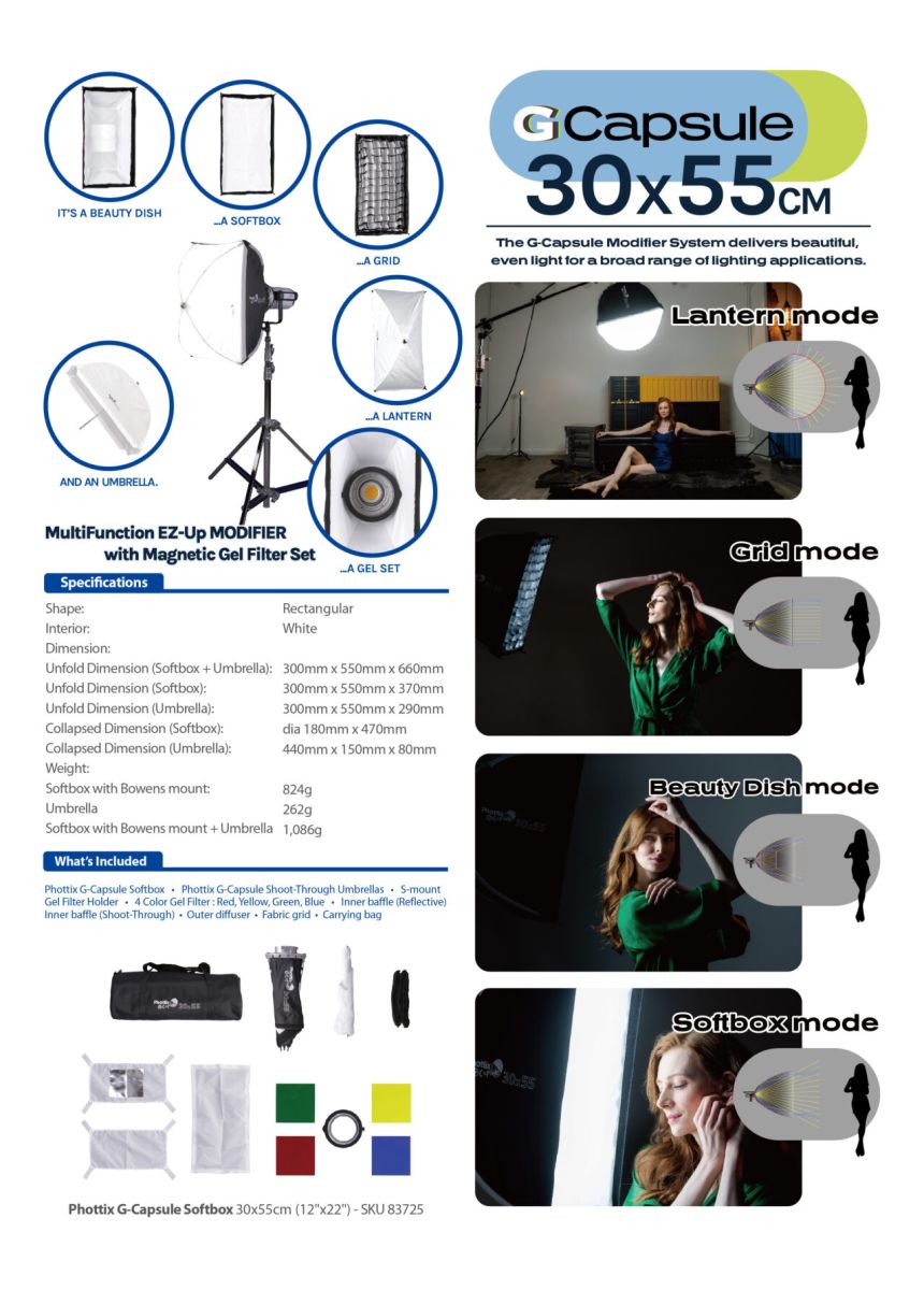 The G-Capsule series is the world’s first all-in-one panoramic light softbox with patented features, offering four versatile modes: Softbox, Grid, Beauty Dish, and Lantern.