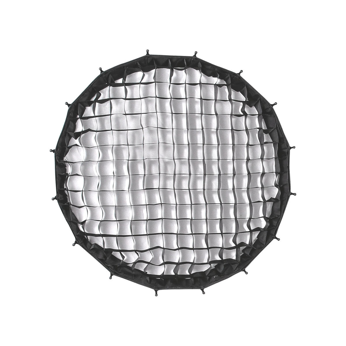 - Combines a shoot-through umbrella with a softbox and grid for versatile use