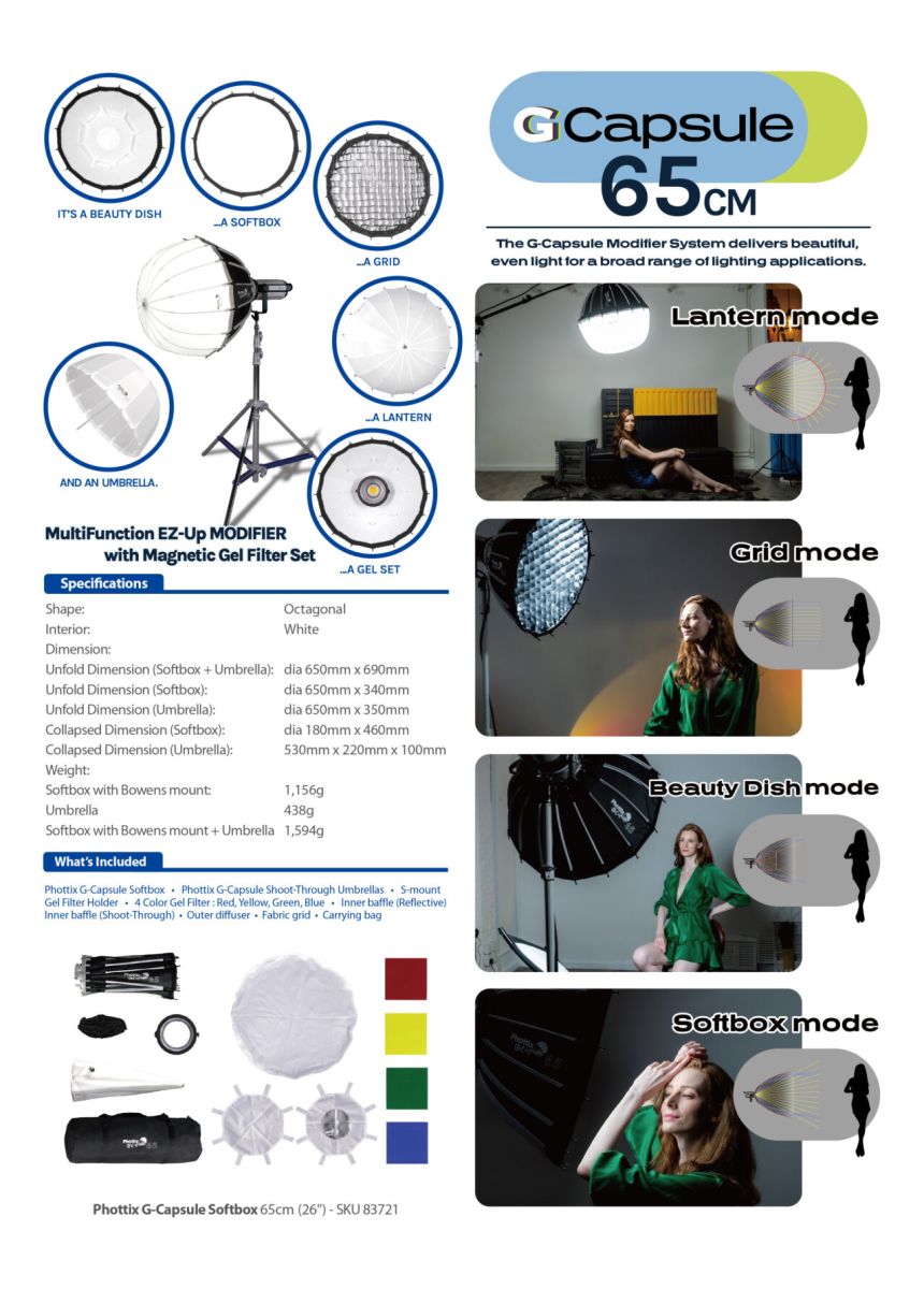 The G-Capsule series is the world’s first all-in-one panoramic light softbox with patented features, offering four versatile modes: Softbox, Grid, Beauty Dish, and Lantern.