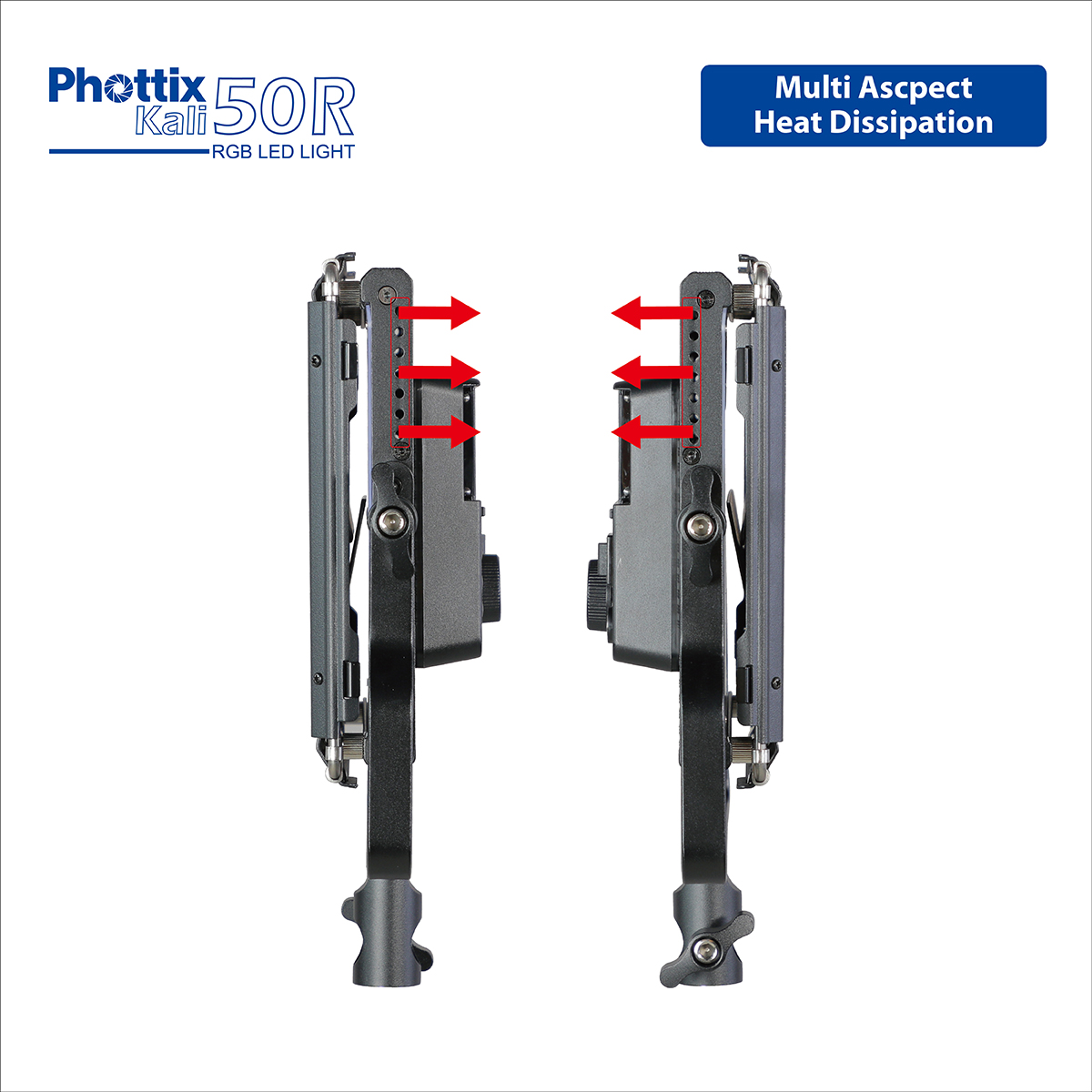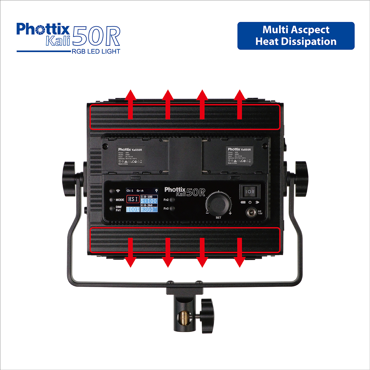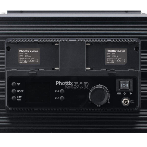 The Kali50R is powered by two Sony-compatible NP Series batteries (not included) for use on-the-go, barndoors and AC adapter (included).