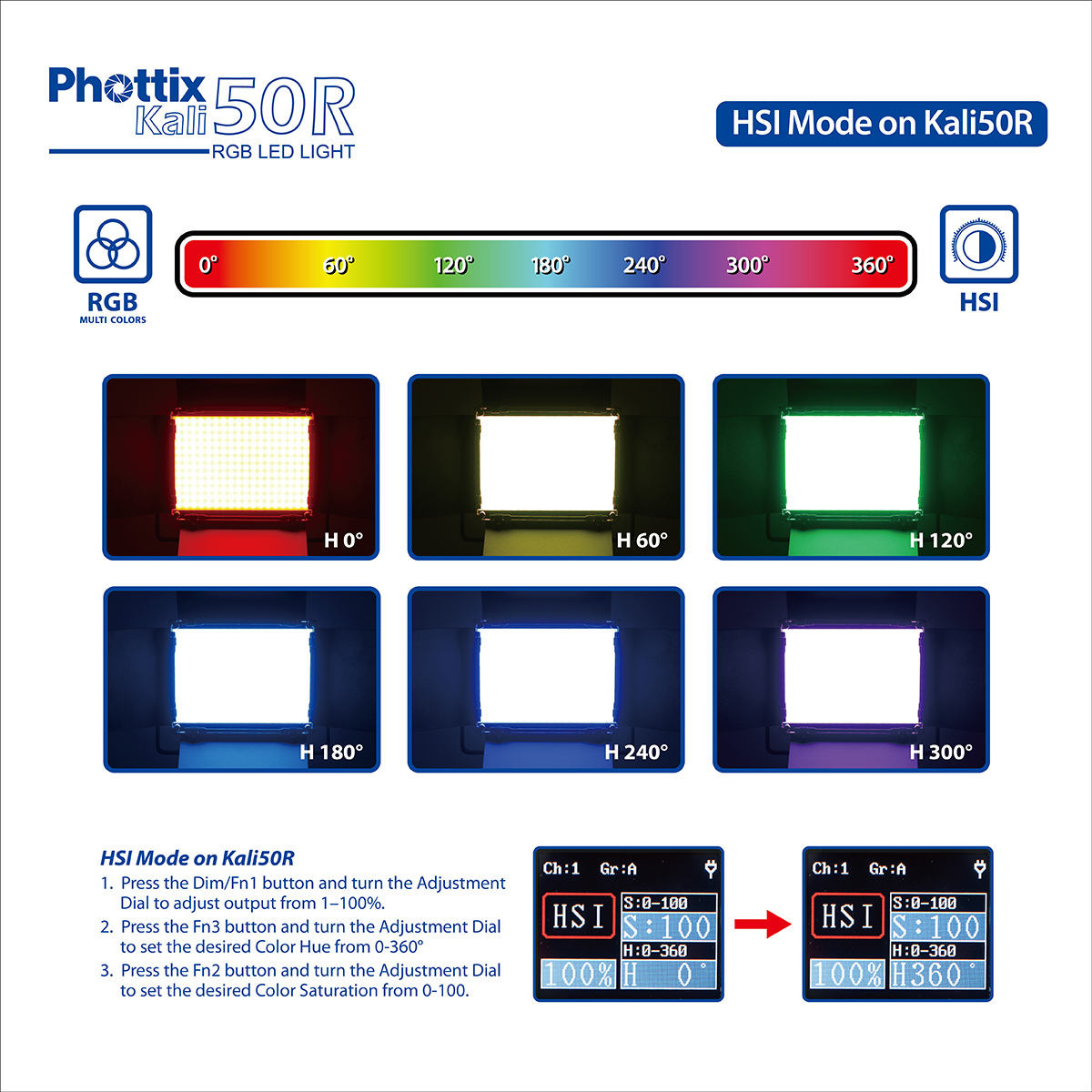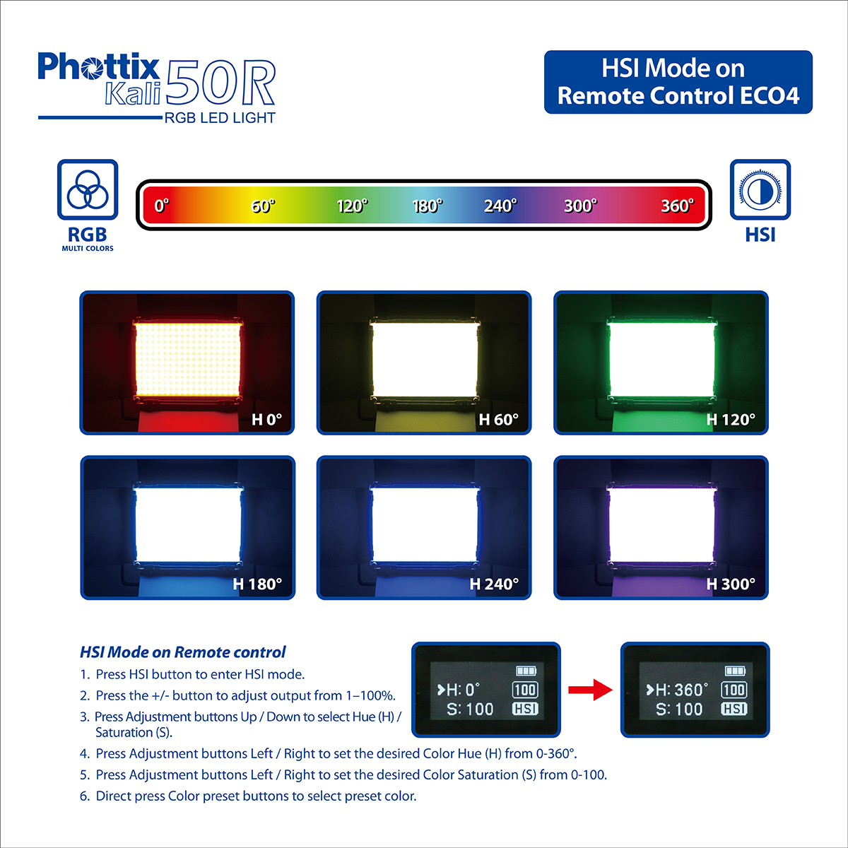 - 0-360° full colour and saturation adjustment (HSI)