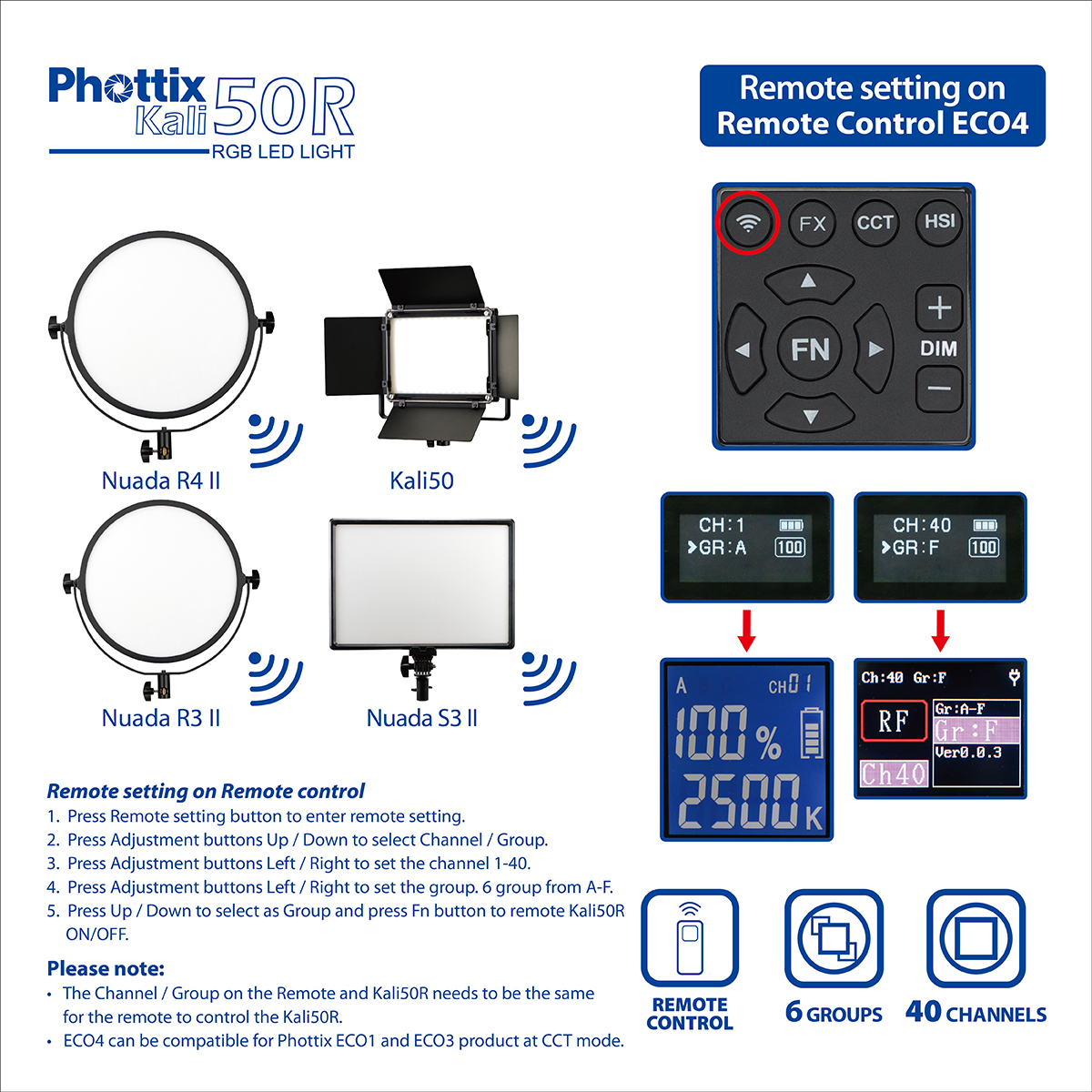 - 2.4G remote control with 6 groups and 40 channels