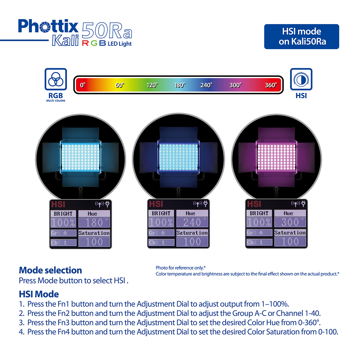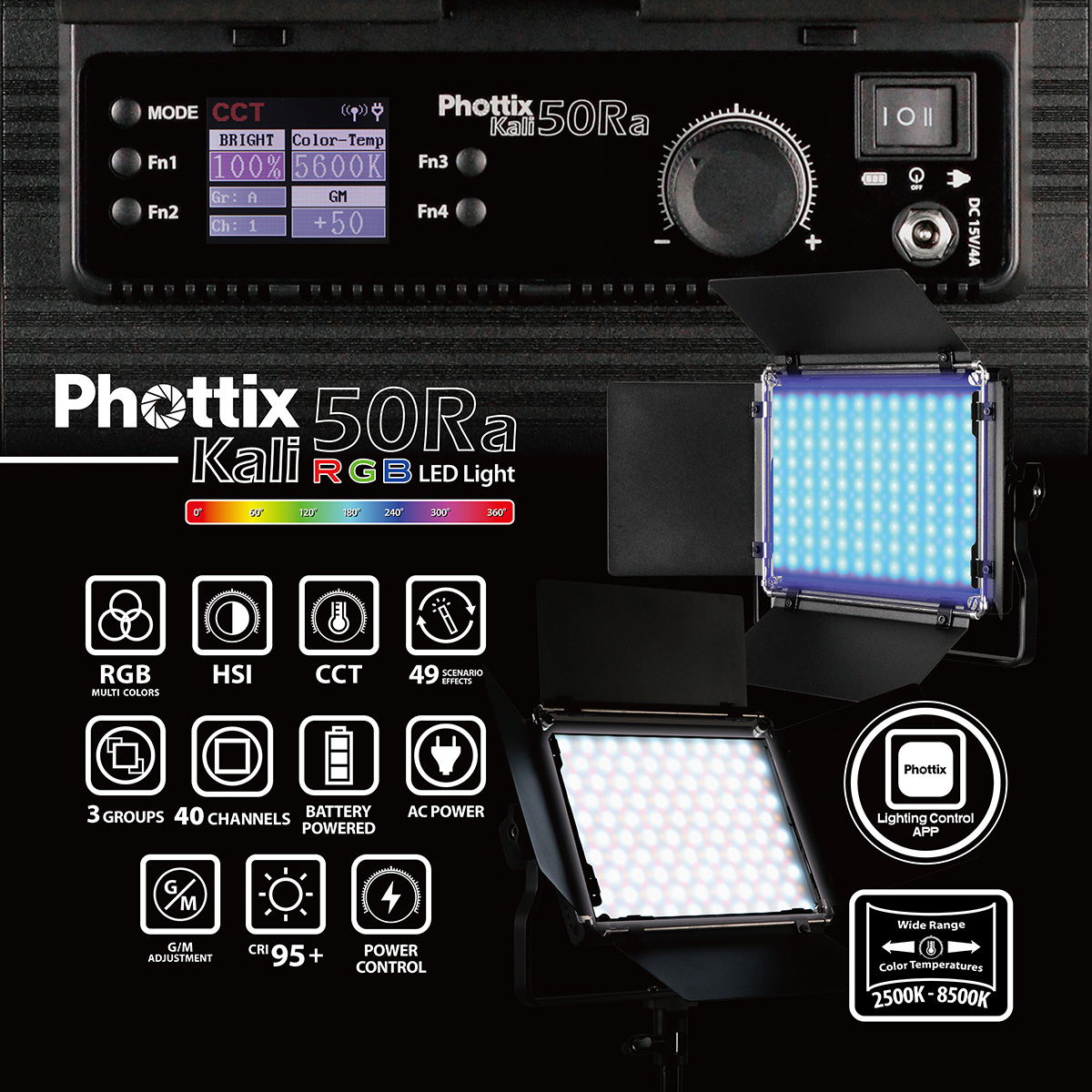 The Phottix Kali50Ra has a 50W power output, full 0-360° colour hue and saturation adjustment, and a G/M value -50 to +50 adjustment function for CCT mode. It can be configured in 3 groups(A/B/C/All) and 40 channels of lighting settings through the smartphone App Bluetooth remote control.