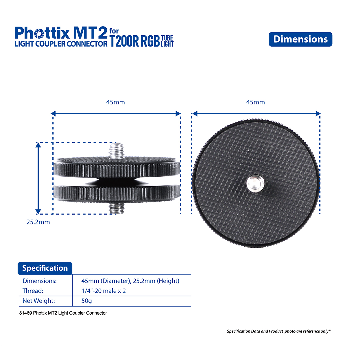 The Phottix MT2 Light Coupler Connector is designed to enhance the connectivity and stability of the T200R. It allows you to seamlessly mount multiple T200R units together, creating a cohesive and powerful lighting solution. Each connector features 1/4" - 20 male threads on its top and bottom surfaces, ensuring compatibility with the T200R and providing secure attachment options.