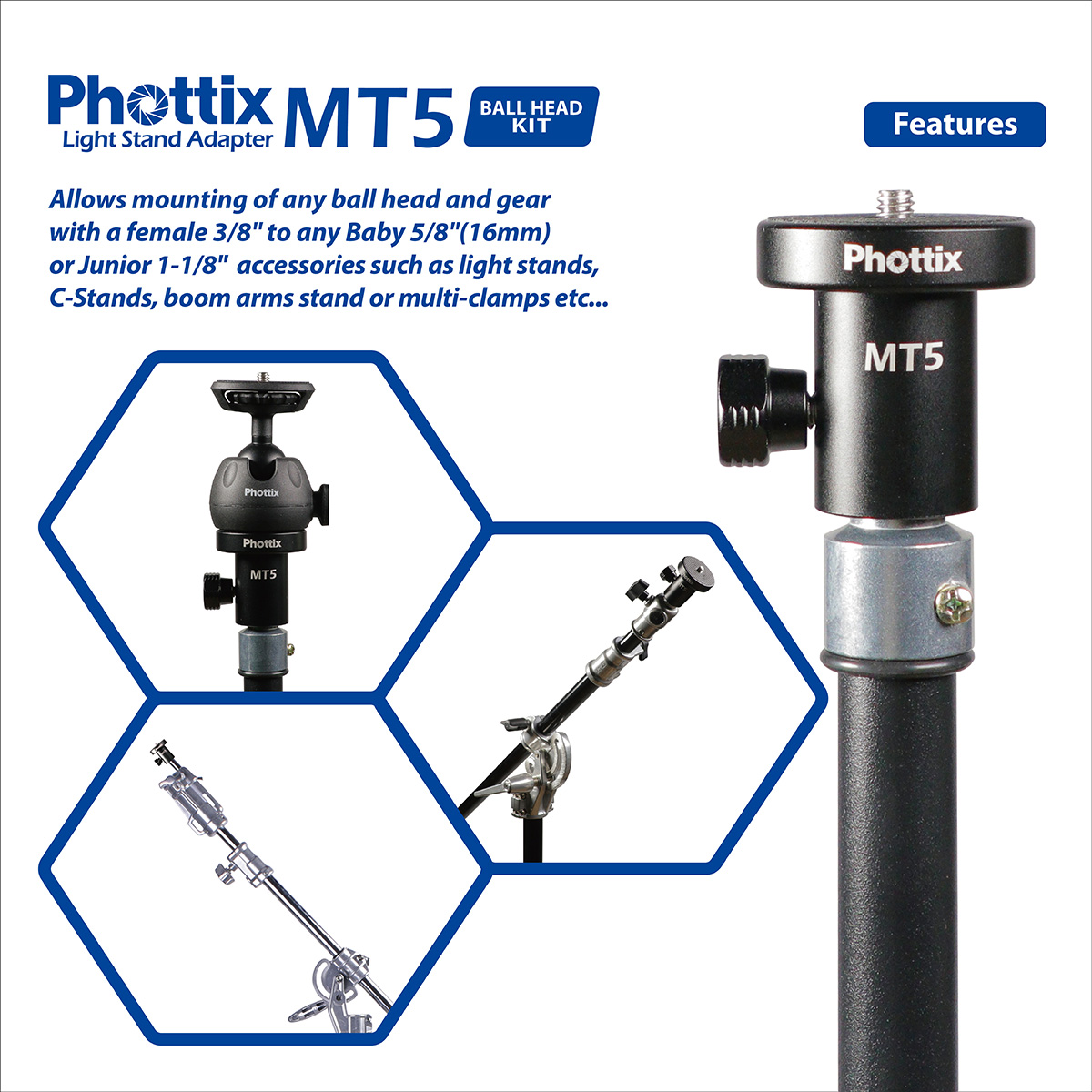 The MT5 Light Stand Adapter Ball Head Kit includes ball head, light stand adapter, smartphone clip and cold shoe. These accessories can be simply assembled with a light stand adapter. It is compatible with any ball head, crossbar or equipment with a female 3/8” to any Baby 5/8” (16mm) or Junior 1-1/8” photography accessories (with column tube diameter≤16mm), such as light stands, C-Stands, boom arm stands, multi-clamps and more.