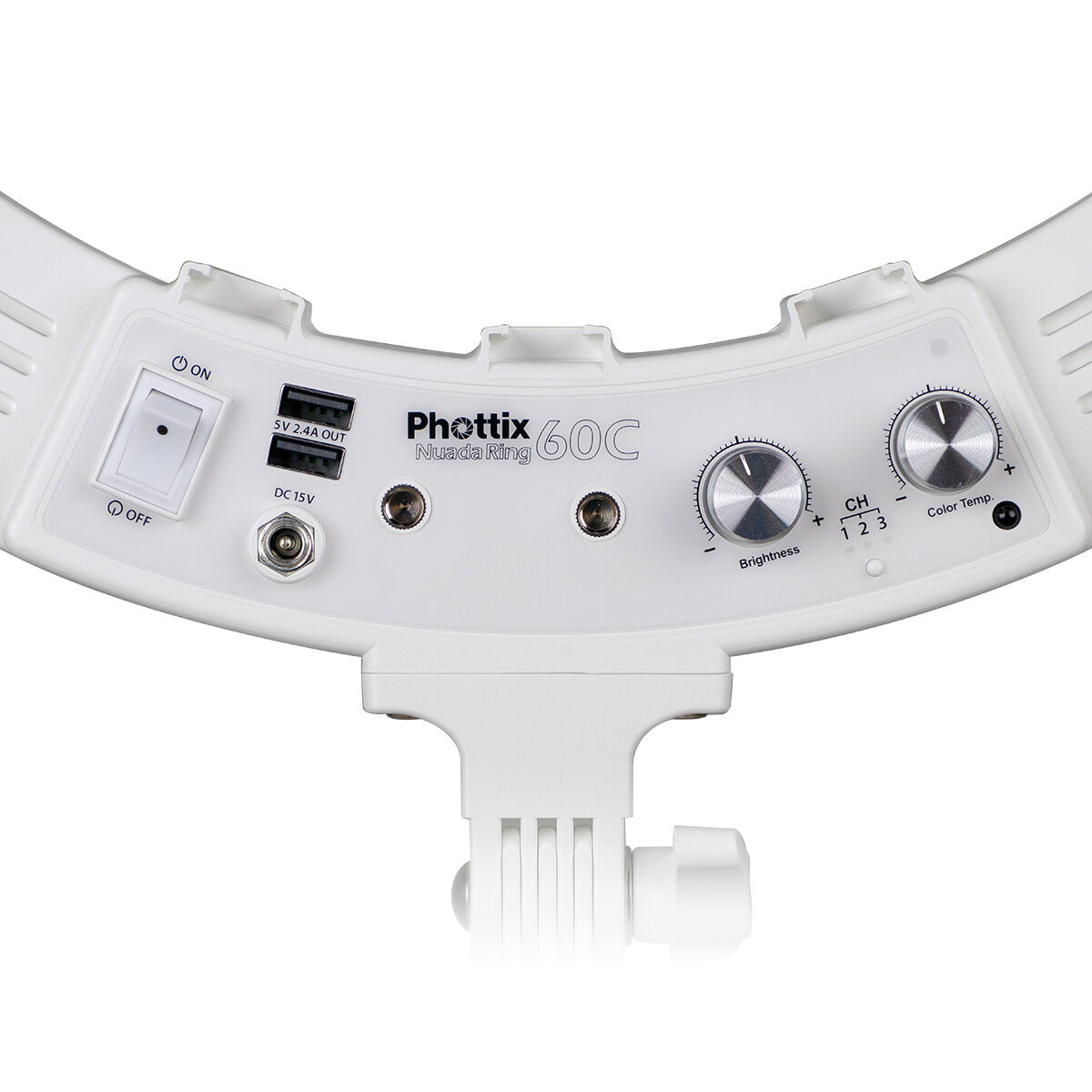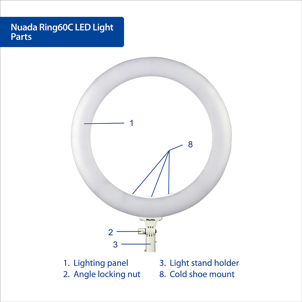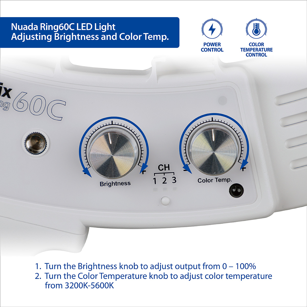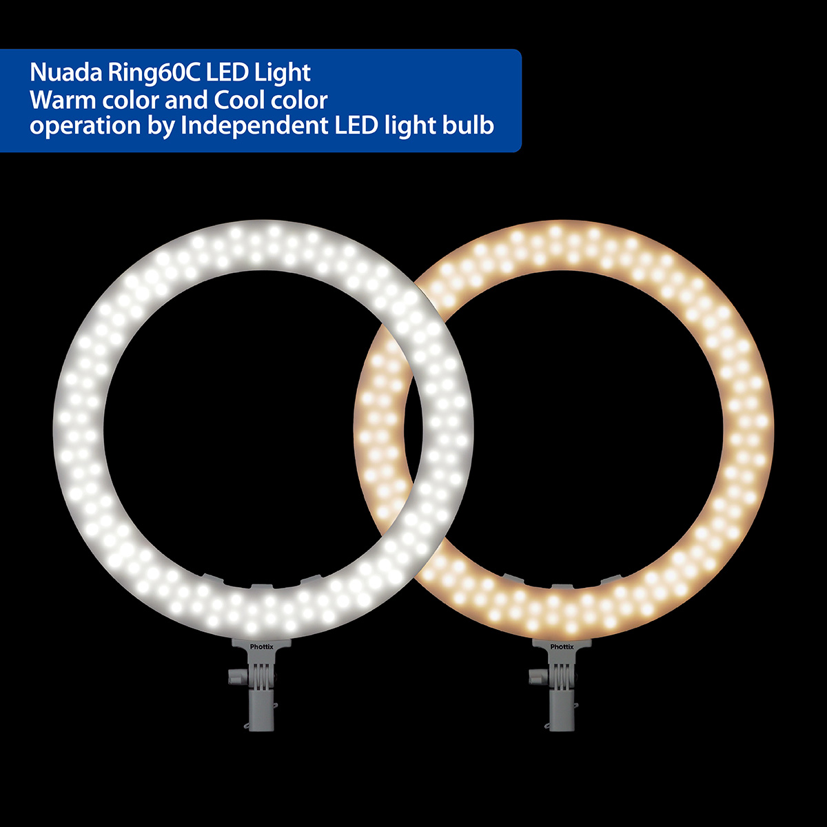 The Nuada Ring60C LED Light is a 18" diameter bicolour LED light built-in Phottix LED Ecosystem (ECO2) that can be fully adjustable colour temperature and power range that runs seamlessly from warm tungsten to cool daylight with excellent colour fulfils the CRI rating of 96+/TLCI 98+.