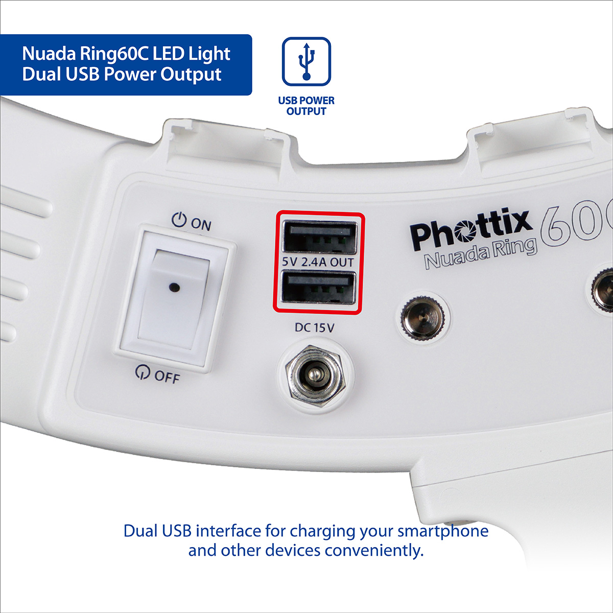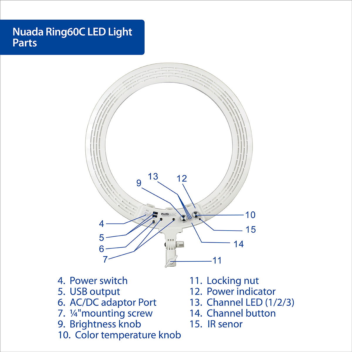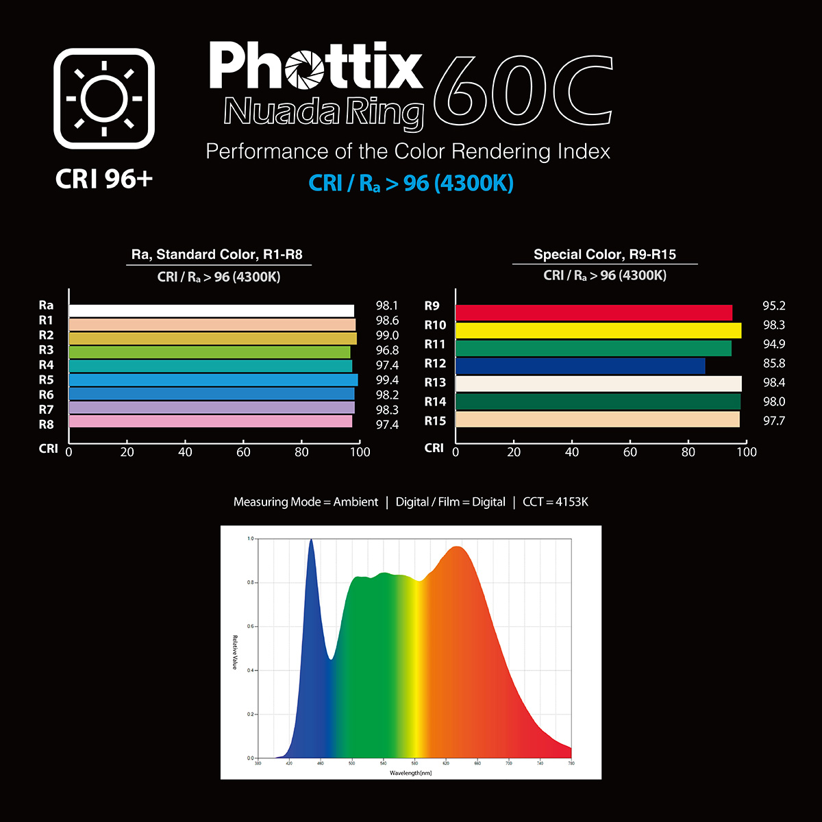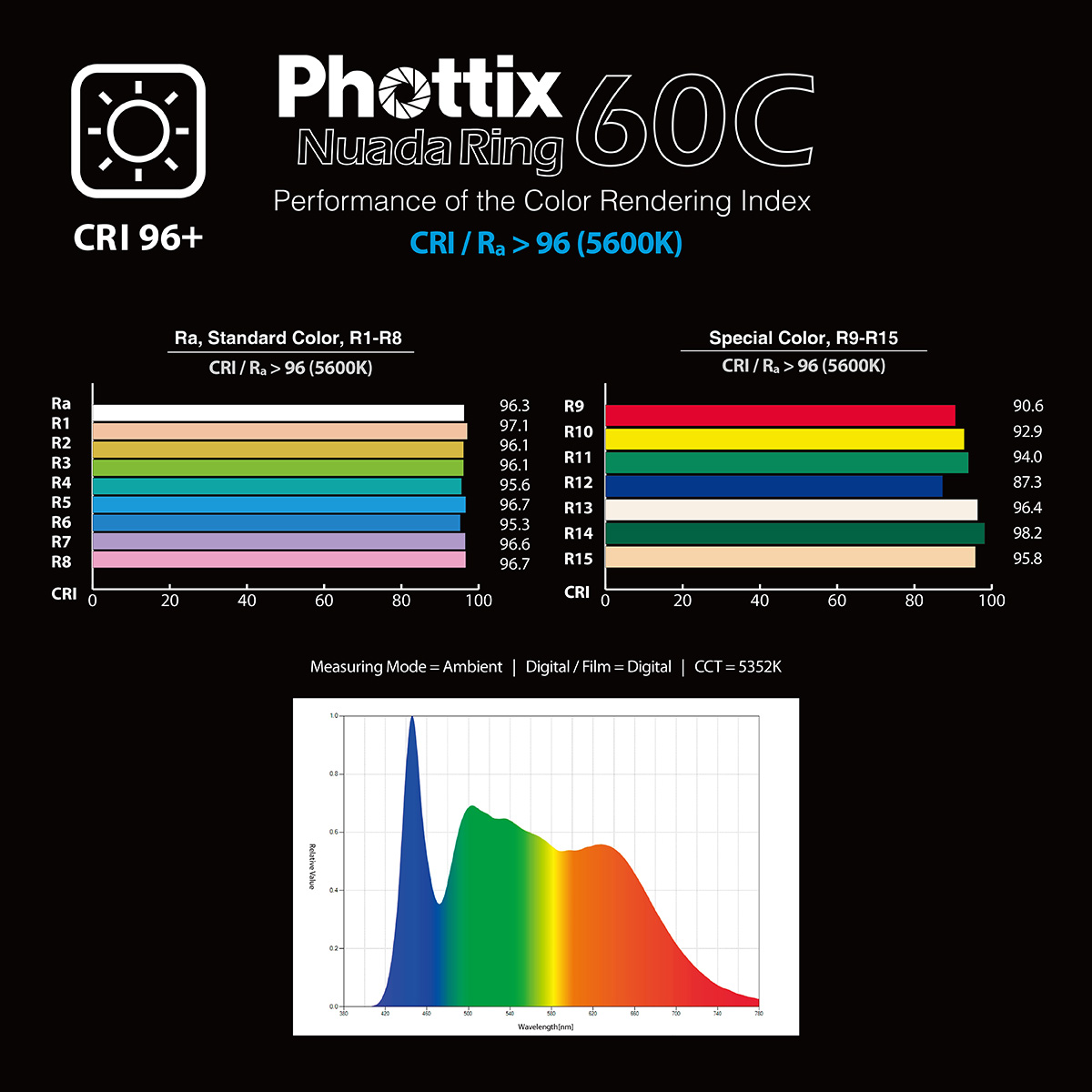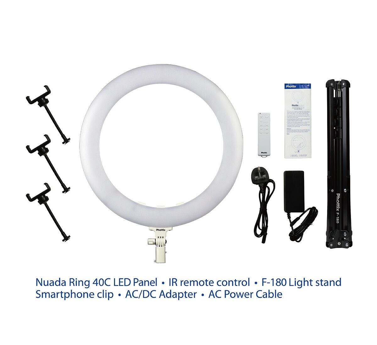 The Nuada Ring60C LED Light is a 18" diameter bicolour LED light built-in Phottix LED Ecosystem (ECO2) that can be fully adjustable colour temperature and power range that runs seamlessly from warm tungsten to cool daylight with excellent colour fulfils the CRI rating of 96+/TLCI 98+.