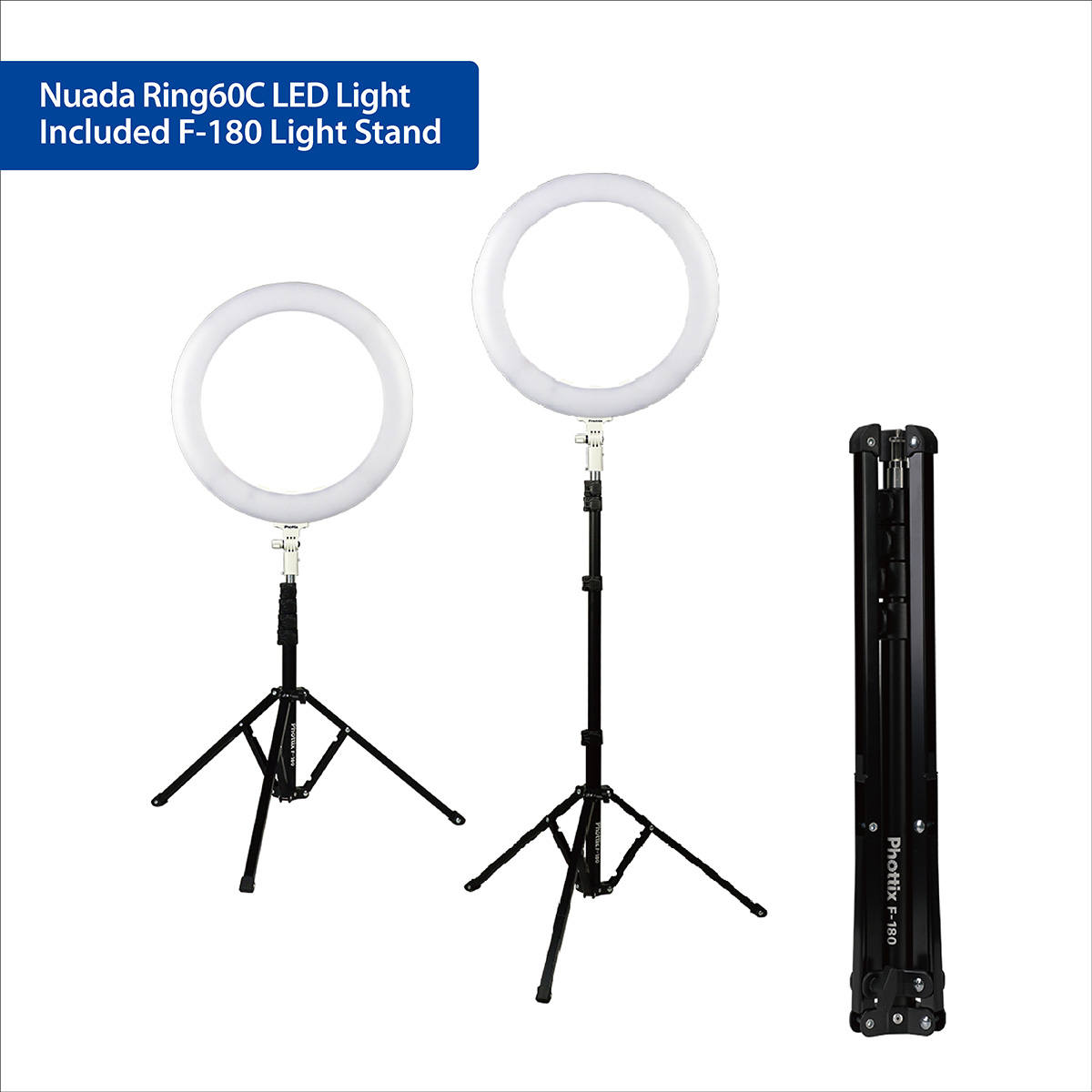 The Nuada Ring60C LED Light included F-180 Light Stand (extended height 180cm / collapsed height 46cm), F-180 is extending to 5.9 feet when fully extended, topped with a 1/4" threaded mount widely used as a support system for most of the photographic equipment such as different lights of strobe/flashlight and lightweight LED light.