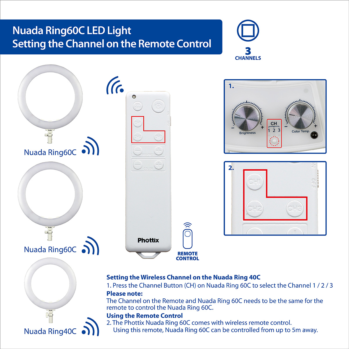 Dimmable colour temperature and brightness with the two parameters can be adjusted from the Phottix LED Ecosystem (ECO2) easy to setup the lighting(s) through the infrared wireless remote control with 3 channels (CH1/CH2/CH3), Phottix LED Ecosystem (ECO2) compatible with both Ring60C LED light.