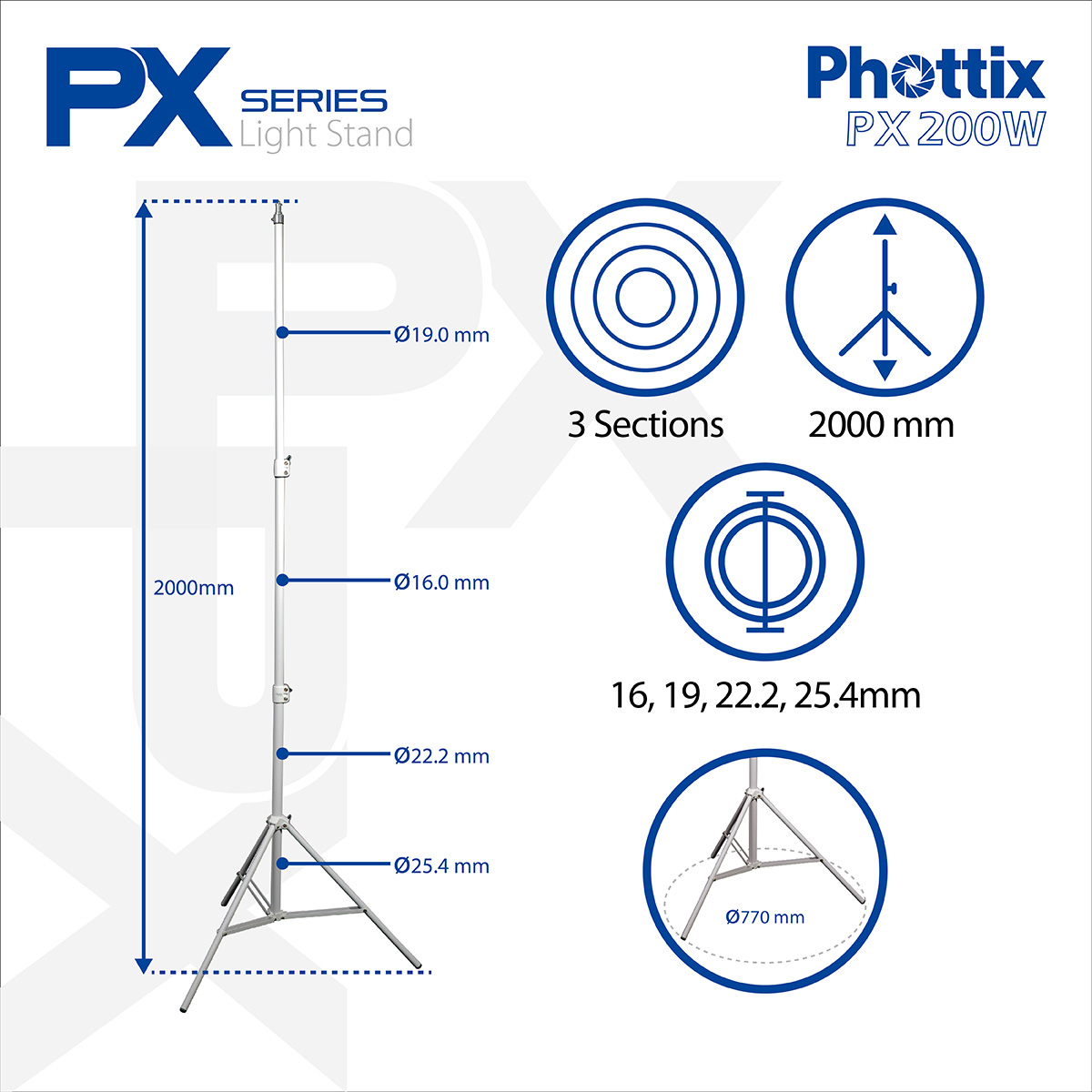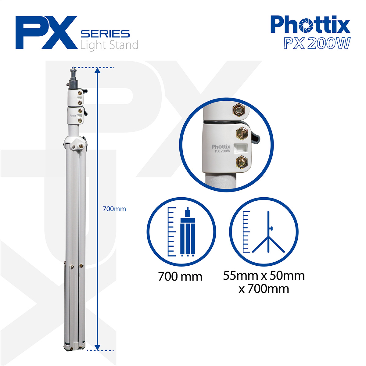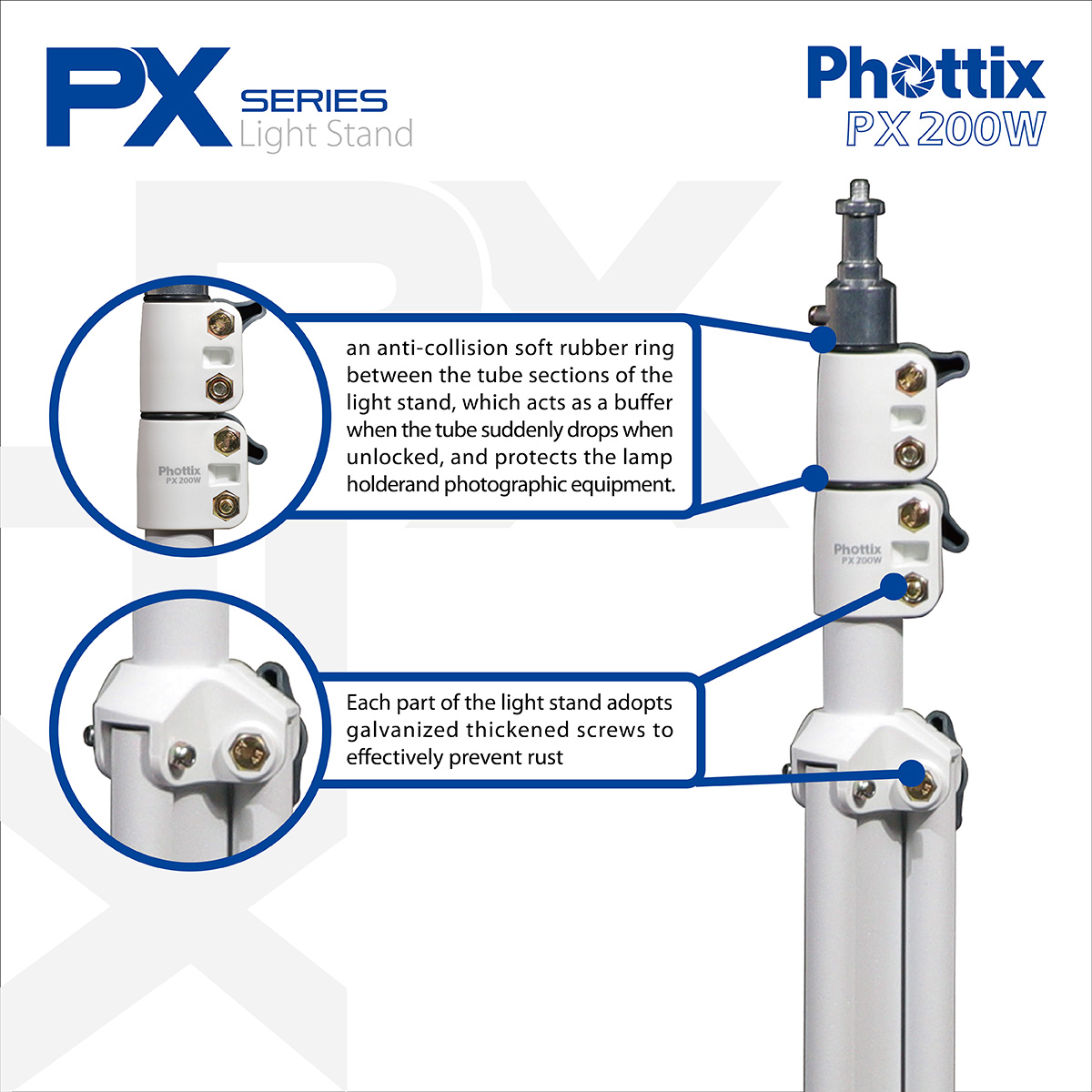 The Phottix PX200W Light Stand, Pearl White - 200cm is made of rugged and durable die-cast steel tubing. It provides a stylish and streamlined corner design, with frosting technology on the light stand tube surface.