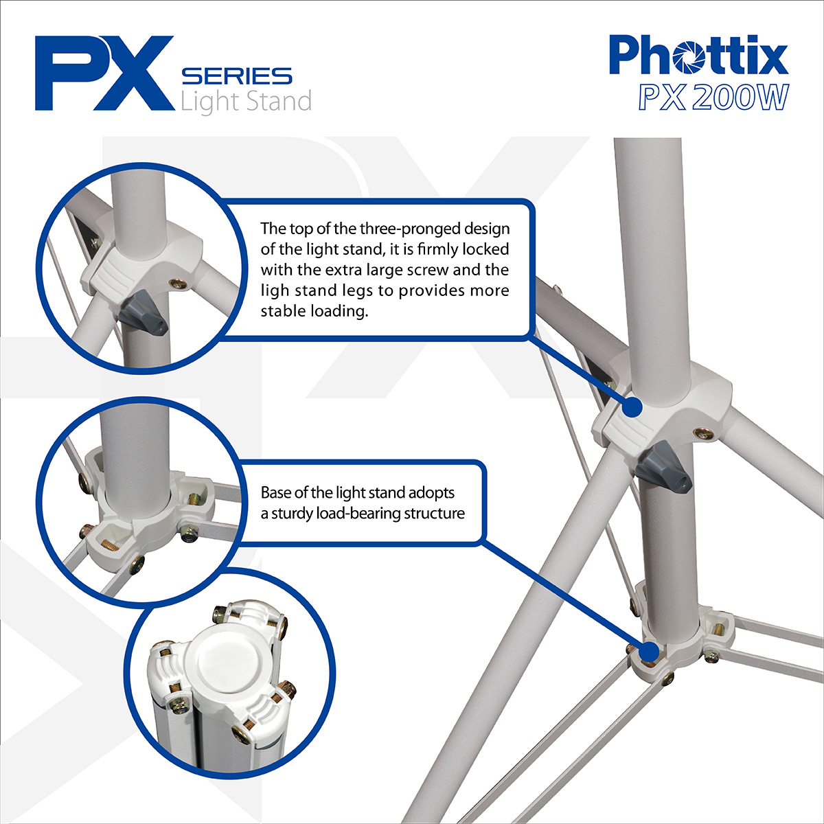 - The top of the three-pronged design of the light stand, it is firmly locked with the extra large screw and the light stand legs to provides more stable loading