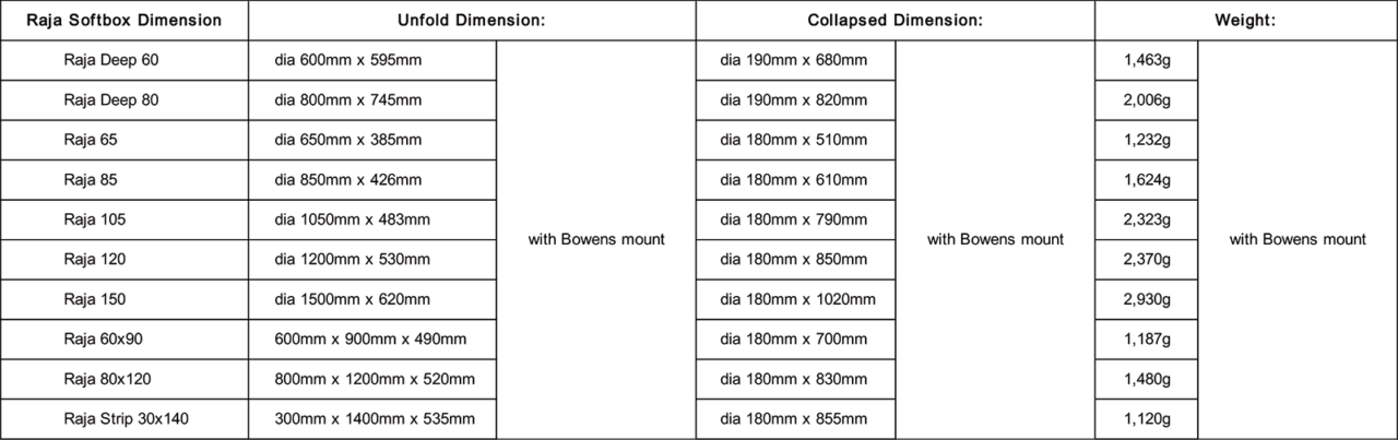 - Collapsed Size (with Bowens Mount) : Diameter 180 x 790mm