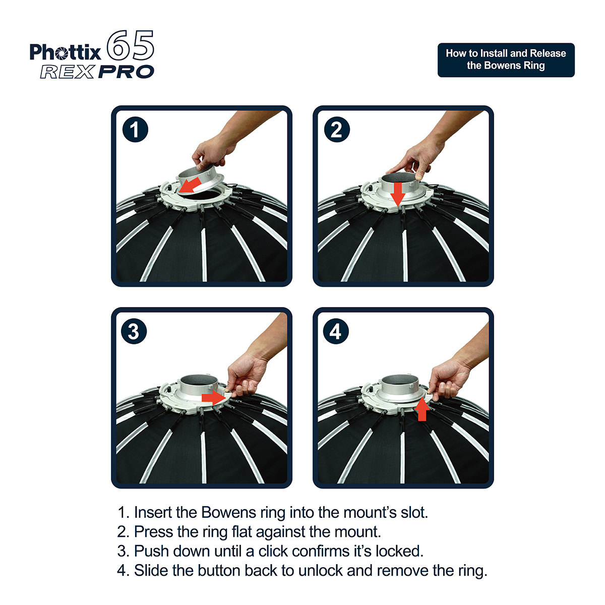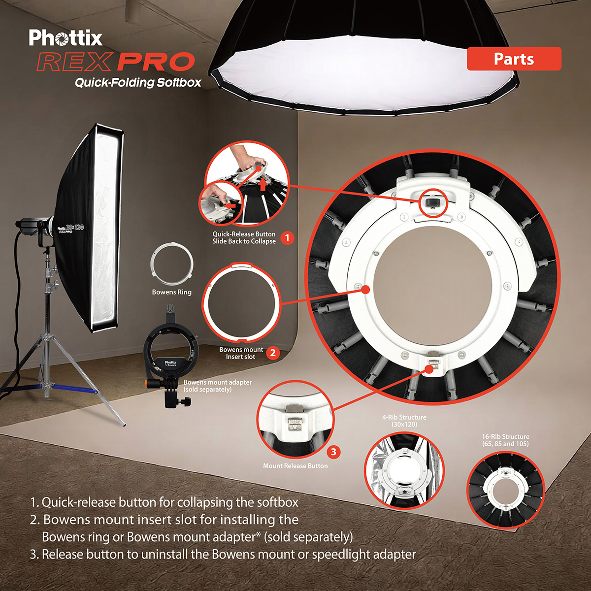Quick-Release Bowens Mount on Softbox : The Rex Pro Softbox offers easy insertion for installation and a one-click button release with its Bowens mount design.