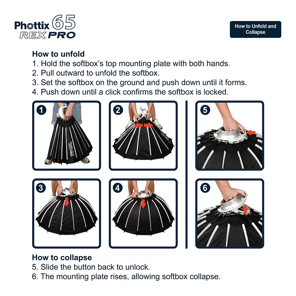 - Quick and easy one-step "push-down" softbox unfolding