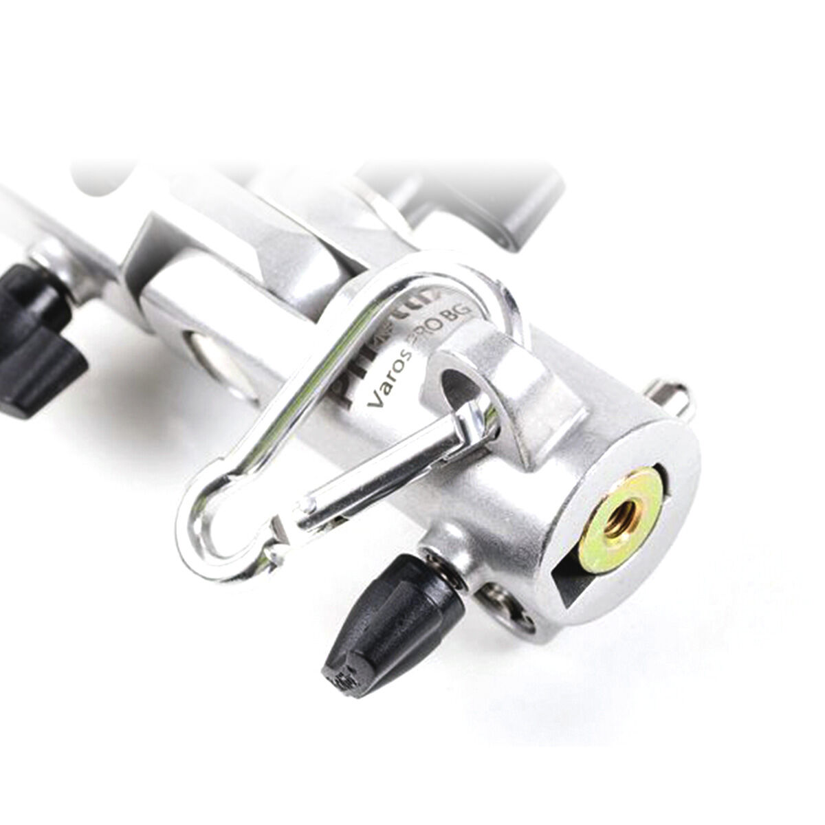 The patented Phottix Varos Pro BG’s locking mechanism has been redesigned to hold the bottom 3/8" and 1/4" female threaded insert with 300% more locking force to keep the umbrella shafts more secure. The 180° tilting mechanism supports up to 30kg. New locking features holds bottom lugs secure until locking button is released. Included is a hanging hole and clip included for use with a counter weight.