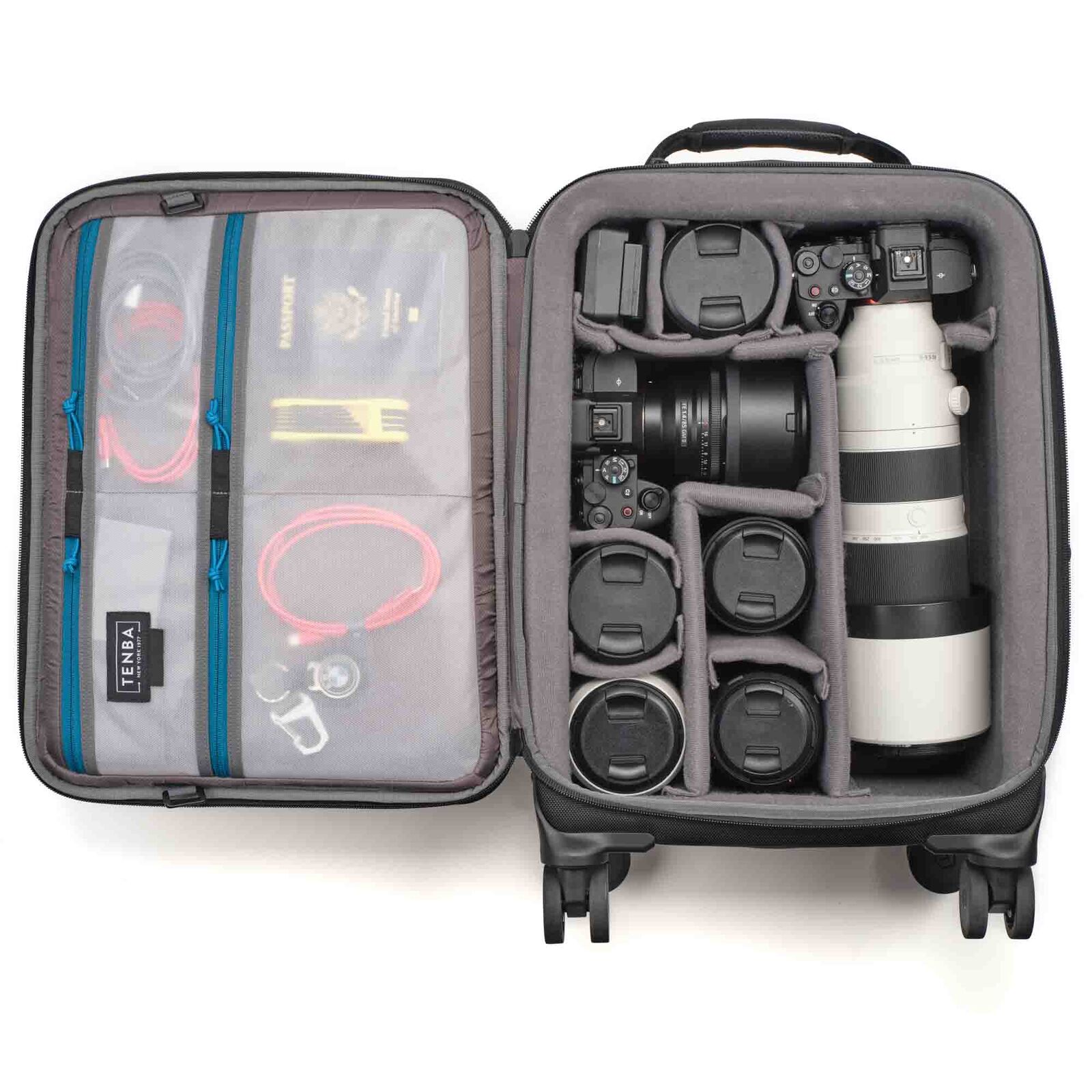 Each case is built for the demanding professional, with water-repellant 1680D ballistic nylon exteriors, durable YKK zippers, stress point reinforcements, and infinitely configurable interiors. Roadies are exquisitely crafted with distinctive yet discreet good looks. All materials and components have been carefully selected to ensure the case delivers years of reliable protection and use. The Roadie V2 Spinner 21 Air Case fits 2-3 Mirrorless or DSLR cameras (up to Pro size with grip), 8-10 lenses (up to 400mm 2.8 or 180-600mm), plus laptop up to 16" (40cm). It meets most of the strictest international carry-on regulations, plus it is safe to check as luggage if necessary.