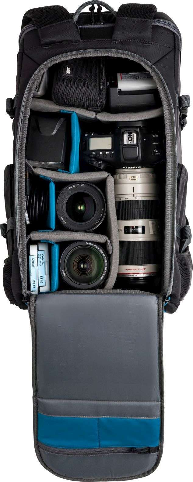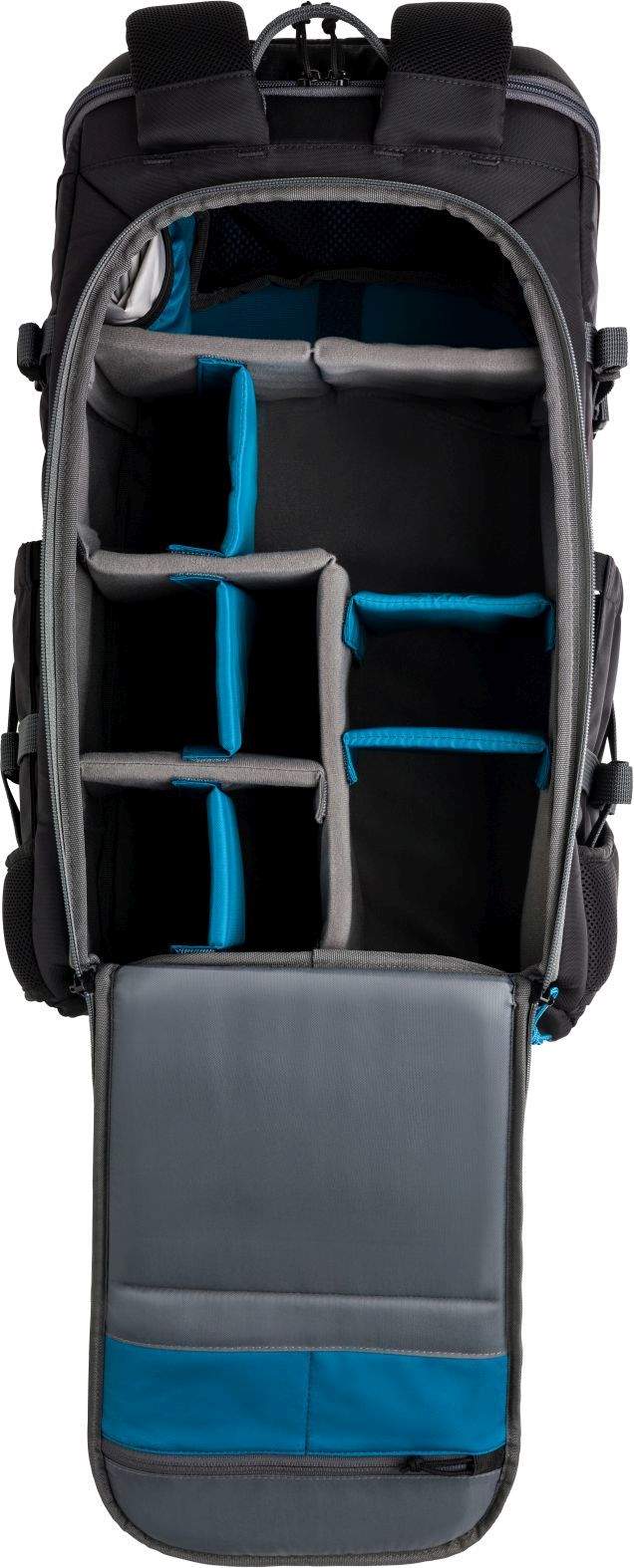 - Gray and blue interior for good visibilty of black camera gear.